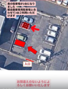 前回お伝えした軽自動車専用駐車場1台と以前からお伝えしていた駐車場が2台になり合計3台お使いいただけます。